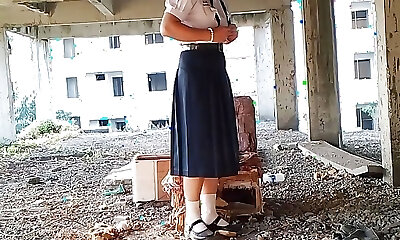azjatycka studentka t-dziewczyna ubrana w mundurek szkolny, podczas gdy wali konia